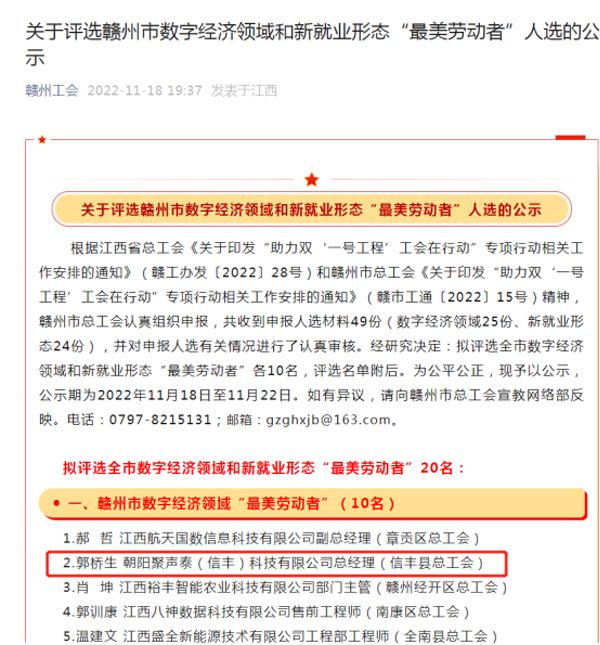 日前,根據(jù)關(guān)于評選贛州市數(shù)字經(jīng)濟領(lǐng)域和新就業(yè)形態(tài)“最美勞動者”人選的公示名單中,朝陽聚聲泰(信豐)科技有限公司總經(jīng)理郭橋生榮登贛州市數(shù)字經(jīng)濟領(lǐng)域“最美勞動者”榜單。